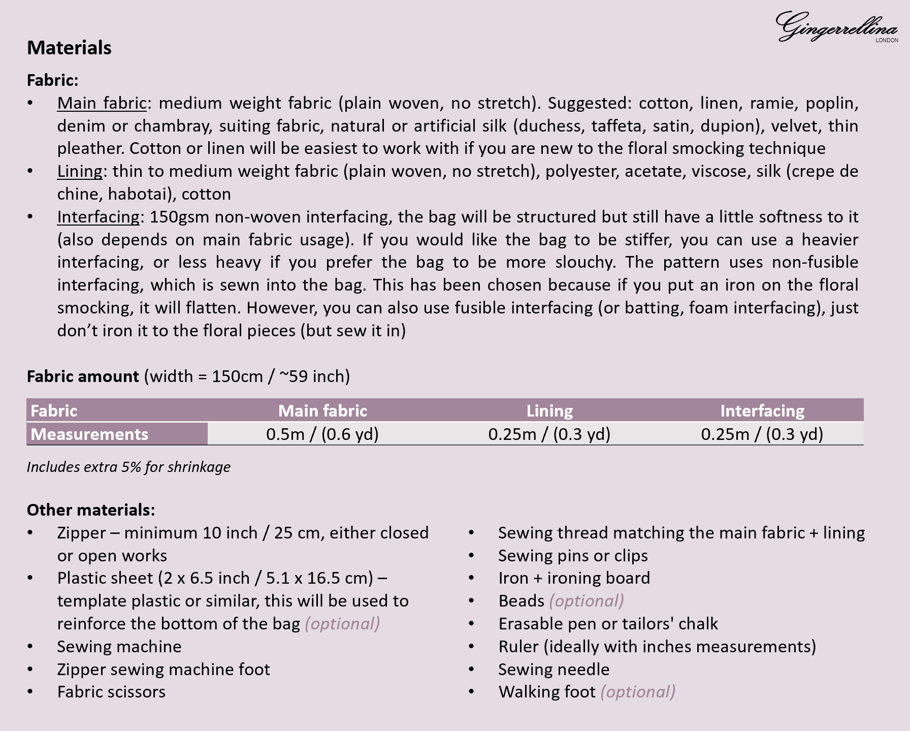 Interfacing: 150gsm non-woven interfacing, the bag will be structured but still have a little softness to it (also depends on main fabric usage). If you would like the bag to be stiffer, you can use a heavier interfacing, or less heavy if you prefer the bag to be more slouchy. The pattern uses non-fusible interfacing, which is sewn into the bag. This has been chosen because if you put an iron on the floral smocking, it will flatten them. However, you can also use fusible interfacing (or batting, foam interfacing), just don’t iron it to the floral pieces (but sew it in)