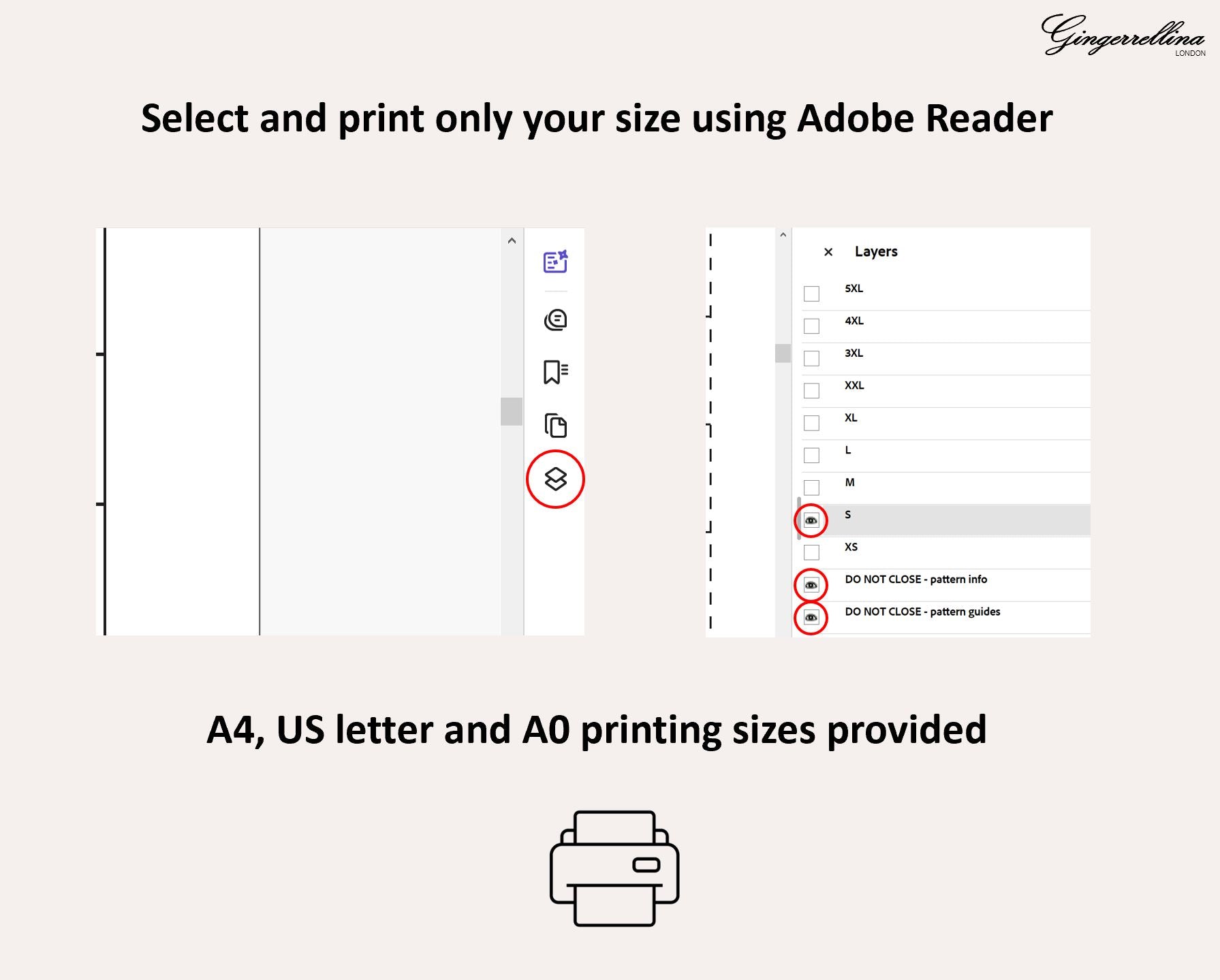 The PDF pattern has been designed with layers for each size, enabling you to select and only print your size in Adobe Acrobat Reader (please make sure to print at actual size and check the test square).